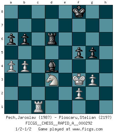 Last move : 1/2-1/2 2023 July 2 16:6:12 [Event "FICGS__CHESS__RAPID_A__000292"] [Site "FICGS"] [Date "2023.02.21"] [Round "1"] [White "Pech,Jaroslav"] [Black "Ploscaru,Stelian"] [Result "1/2-1/2"] [WhiteElo "1987"] [BlackElo "2197"] 1.d4 d5 2.c4 e6 3.Nc3 Nf6 4.Nf3 c6 5.e3 Nbd7 6.Qc2 Bd6 7.Bd3 O-O 8.O-O dxc4 9.Bxc4 a6 10.a4 c5 11.Rd1 cxd4 12.exd4 Qc7 13.Qe2 b6 14.Bg5 h6 15.Bxf6 Nxf6 16.Rac1 Bb7 17.d5 Nxd5 18.Nxd5 exd5 19.Bxd5 Bc5 20.Qe5 Rac8 21.Qxc7 Rxc7 22.Bxb7 Rxb7 23.g3 Re8 24.Kf1 R8e7 25.Ne1 Red7 26.Rxd7 Rxd7 27.Ke2 Kf8 28.Nd3 Bd4 29.Kf3 f5 30.h4 Rd6 31.b4 g5 32.hxg5 hxg5 1/2-1/2 Follow this game move after move (download)Of all my Russian books, the defense contains and diffuses the greatest 'warmth' which may seem odd seeing how supremely abstract Chess is supposed to be. (Vladimir Nabokov) Die Auseinandersetzung mit Karpow war politisch geprägt. Er stand für das kommunistische System, wurde von dessen Repräsentanten gehätschelt. Ich war der Oppositionelle. Jeder Schachweltmeister spiegelt auch die gesellschaftlichen Verhältnisse wider. Kramnik steht für die Börsen-Generation des Neuen Markts, ideologiefrei, zahlenfixiert. (Garry Kasparov) En el Ajedrez, cuando menos, el valiente hereda la tierra. (Edmar Mednis) Je ne suis pas le dernier à jouer lâchement des coups douteux pendant le zeïtnot de l'adversaire pour l'achever: en effet les coups qui font le plus peur sont ceux que l'on ne comprend pas. Je me fais souvent peur quand je joue. (Un professeur anonyme) Horse racing is animated roulette. (Roger Kahn)