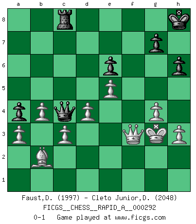 Last move : 0-1 2023 May 4 9:33:58 [Event "FICGS__CHESS__RAPID_A__000292"] [Site "FICGS"] [Date "2023.02.21"] [Round "1"] [White "Faust,Dieter"] [Black "Cleto Junior,Dirceu"] [Result "0-1"] [WhiteElo "1997"] [BlackElo "2048"] 1.Nf3 d5 2.b3 Bf5 3.Bb2 e6 4.d3 h6 5.Nbd2 Nf6 6.g3 Be7 7.Bg2 c6 8.O-O O-O 9.Re1 Bh7 10.e4 a5 11.a3 Nbd7 12.Qe2 Qb6 13.Rac1 Rfd8 14.exd5 cxd5 15.d4 Rac8 16.c3 Bf5 17.h3 Bf8 18.Qe3 a4 19.g4 Bh7 20.b4 Qa6 21.Ne5 b5 22.f4 Rc7 23.Bf1 Ne4 24.Nxe4 Bxe4 25.Bd3 f5 26.Qe2 Nxe5 27.fxe5 Be7 28.Bxb5 Qb7 29.Ba6 Qa8 30.Bd3 Bh4 31.Rf1 f4 32.Rf3 Rdc8 33.Kg2 Kh8 34.Bxe4 dxe4 35.Rxf4 Bg5 36.Rcf1 Bxf4 37.Rxf4 Qa7 38.Qxe4 Rf7 39.Rxf7 Qxf7 40.Qf3 Qc7 41.Kg3 Qc4 0-1 Follow this game move after move (download)Those who say they understand Chess, understand nothing. (Robert Hubner) Ich habe Kasparov in Rente geschickt. (Veselin Topalov) Todo se encuentra en un estado de flujo y esto incluye al mundo del Ajedrez. (Mikhail Botvinnik) On est toujours la mazette de quelqu'un d'autre. (Anonyme) There are two kinds of tragedy in this world, one is not getting what you want and the other is getting. (Lord of war)