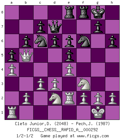 Last move : 1/2-1/2 2023 May 7 9:54:46 [Event "FICGS__CHESS__RAPID_A__000292"] [Site "FICGS"] [Date "2023.02.21"] [Round "1"] [White "Cleto Junior,Dirceu"] [Black "Pech,Jaroslav"] [Result "1/2-1/2"] [WhiteElo "2048"] [BlackElo "1987"] 1.e4 e5 2.Nf3 Nc6 3.Bc4 Nf6 4.d3 Bc5 5.O-O d6 6.c3 a6 7.Bb3 O-O 8.Re1 h6 9.Nbd2 Be6 10.Bxe6 fxe6 11.a4 a5 12.Qb3 Qd7 13.Nc4 b6 14.Be3 Bxe3 15.Rxe3 Ng4 16.Re2 Nf6 17.Qb5 Rae8 18.Ncd2 1/2-1/2 Follow this game move after move (download)Weak points or holes in the opponent's position must be occupied by pieces not Pawns. (Siegbert Tarrasch) Zu meiner Zeit war ein 20 jähriger ein junger Spieler, heute ist er ein Veteran. (Garry Kasparov) Muchos se han convertido en Maestros de Ajedrez, nadie se ha convertido en el Maestro del Ajedrez. (Siegbert Tarrasch) Le thème de l'attaque double intervient d'une manière ou d'une autre dans l'immense majorité des combinaisons. (Youri Averbakh) The question of whether computers can think is just like question of whether submarines can swim. (Edsger W. Dijkstra)