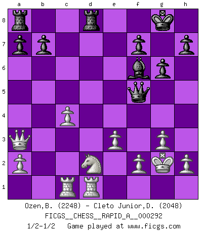 Last move : 1/2-1/2 2023 March 13 15:45:17 [Event "FICGS__CHESS__RAPID_A__000292"] [Site "FICGS"] [Date "2023.02.21"] [Round "1"] [White "Ozen,Bahadir"] [Black "Cleto Junior,Dirceu"] [Result "1/2-1/2"] [WhiteElo "2248"] [BlackElo "2048"] 1.d4 Nf6 2.c4 g6 3.g3 Bg7 4.Bg2 O-O 5.Nf3 c6 6.O-O d5 7.b3 dxc4 8.bxc4 c5 9.Bb2 Qb6 10.Qc1 cxd4 11.Nxd4 Rd8 12.e3 Bd7 13.Nd2 Nc6 14.Bc3 Qc7 15.Qa3 Qc8 16.Rfd1 e5 17.Nxc6 Bxc6 18.Bxe5 Qf5 19.Bxf6 Bxf6 20.Rac1 Bxg2 21.Kxg2 1/2-1/2 Follow this game move after move (download)The most powerful weapon in Chess is to have the next move. (David Bronstein) Schach ist ein Teil der Kultur, und wenn es mit der Kultur abwärts geht, geht es auch mit dem Schach abwärts. (Mikhail Moiseyevich Botvinik) El Ajedrez es un expediente tonto que hace creer a la gente inactiva que hacen una cosa muy astuta cuando solamente estan perdiendo su tiempo. (George Bernard Shaw) Il s'avisa de me proposer d'apprendre les échecs qu'il jouait un peu... me voilà forcené des échecs. J'achète un échiquier, je m'enferme dans ma chambre, j'y passe des jours et des nuits à vouloir apprendre par cur toutes les parties. (Jean-Jacques Rousseau, Confessions) May I never be complete. May I never be content. May I never be perfect. Deliver me, Tyler, from being perfect and complete. (Chuck Palahniuk, Fight Club)