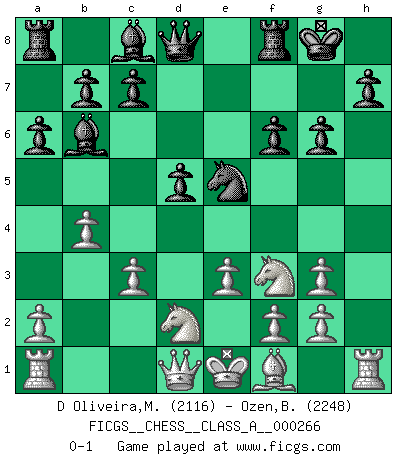 Last move : 0-1 2023 May 20 12:40:40 [Event "FICGS__CHESS__CLASS_A__000266"] [Site "FICGS"] [Date "2023.02.24"] [Round "1"] [White "D Oliveira,Marcos Arruda"] [Black "Ozen,Bahadir"] [Result "0-1"] [WhiteElo "2116"] [BlackElo "2248"] 1.d4 d5 2.Nc3 Nf6 3.Bf4 e6 4.Nb5 Bb4+ 5.c3 Ba5 6.e3 a6 7.Na3 O-O 8.Nb1 Nbd7 9.Nf3 Nh5 10.Be5 g6 11.Nbd2 f6 12.Bg3 e5 13.dxe5 Nxg3 14.hxg3 Nxe5 15.b4 Bb6 0-1 This chess game has been lost on time (started : 2023.02.24 22:46:3) Follow this game move after move (download)I believe that Chess possesses a magic that is also a help in advanced age. A rheumatic knee is forgotten during a game of Chess and other events can seem quite unimportant in comparison with a catastrophe on the chessboard. (Vlastimil Hort) Den Ruhm habe ich schon, jetzt brauche ich noch das Geld. (Wilhelm Steinitz) El Ajedrez es el gimnasio de la mente. (Blaise Pascal) Je fais ceci parce que dans cinquante coups j'obtiendrai cela; je m'appelle Mikhail Moisevitch Botvinnik. (Botvinnik) Wawaweewa ! (Borat: Cultural learnings of America for make benefit glorious nation of Kazakhstan)