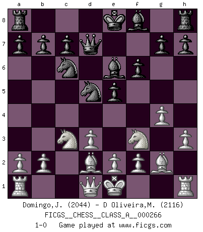 Last move : 1-0 2023 May 19 21:13:12 [Event "FICGS__CHESS__CLASS_A__000266"] [Site "FICGS"] [Date "2023.02.24"] [Round "1"] [White "Domingo,Jordi"] [Black "D Oliveira,Marcos Arruda"] [Result "1-0"] [WhiteElo "2044"] [BlackElo "2116"] 1.g4 d5 2.h3 e5 3.Bg2 Nc6 4.c4 Nge7 5.cxd5 Nxd5 6.Nc3 Be6 7.d3 Qd7 8.Nf3 f6 9.Bd2 1-0 This chess game has been lost on time (started : 2023.02.24 22:46:3) Follow this game move after move (download)Chess is the art which expresses the science of logic. (Mikhail Botvinnik) Darum geht es im Schach. Einen Tag gibst du deinem Gegner eine Lektion, am nächsten Tag gibt er dir eine. (Robert James Fischer) Fischer deseaba darle a los Rusos una sopa de su propia medicina. (Larry Evans) A chaque perte on perd un peu de soi. (Joël Lautier) Hello Thibault, if I have had a plan (and I had one, I hope), I have forgotten it during the last week... - Hello Heinz-Georg. What do you mean a plan ? (Anonymous players, during a Big Chess game)