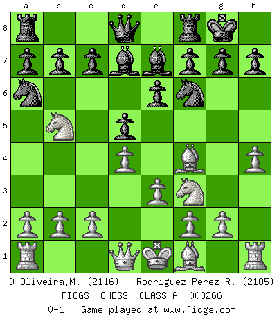 Last move : 0-1 2023 May 6 16:21:1 [Event "FICGS__CHESS__CLASS_A__000266"] [Site "FICGS"] [Date "2023.02.24"] [Round "1"] [White "D Oliveira,Marcos Arruda"] [Black "Rodriguez Perez,Rene"] [Result "0-1"] [WhiteElo "2116"] [BlackElo "2105"] 1.d4 e6 2.Nc3 d5 3.Bf4 Nf6 4.Nb5 Na6 5.e3 Be7 6.Nf3 O-O 7.h4 Bd7 0-1 This chess game has been lost on time (started : 2023.02.24 22:46:3) Follow this game move after move (download)Good positions don't win games, good moves do. (Gerald Abrahams) Ein guter Spieler hat immer Glück. (José Raúl Capablanca) Cuando le juegas a Fischer, no es una cuestion de si vas a ganar o perder. Es una cuestion de si vas a sobrevivir. (Boris Spassky) Je crois qu'il existe des manières très spécifiques de jouer efficacement contre une machine. Evidemment, nous n'avons aucune chance en technique pure, parce que l'ordinateur calcule de manière parfaite. Mais lorsque nous faisons appel à notre cerveau, en utilisant l'intuition et la compréhension, alors nous restons beaucoup plus forts. (Anatoli Karpov) A clear conscience is usually the sign of a bad memory. (Unknown)