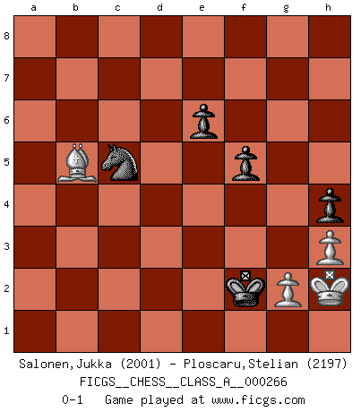 Last move : 0-1 2023 November 17 6:53:23 [Event "FICGS__CHESS__CLASS_A__000266"] [Site "FICGS"] [Date "2023.02.24"] [Round "1"] [White "Salonen,Jukka"] [Black "Ploscaru,Stelian"] [Result "0-1"] [WhiteElo "2001"] [BlackElo "2197"] 1.d4 d5 2.c4 e6 3.Nc3 Nf6 4.Nf3 c6 5.e3 Nbd7 6.Bd3 dxc4 7.Bxc4 b5 8.Bd3 b4 9.Ne4 Nxe4 10.Bxe4 Bb7 11.Qa4 Qb6 12.Bd2 Bd6 13.O-O O-O 14.Rfc1 Rfc8 15.a3 Nf6 16.Bd3 a5 17.e4 Bf8 18.Qd1 Nd7 19.axb4 axb4 20.Rxa8 Rxa8 21.Be3 c5 22.h3 h6 23.Bb1 Rd8 24.Qe2 Qa5 25.Nd2 Ba6 26.Qe1 cxd4 27.Bxd4 Ne5 28.Nb3 Qb5 29.Bc5 g5 30.Bxf8 Kxf8 31.Nc5 Kg7 32.Nxa6 Qxa6 33.Qxb4 Qe2 34.Qc3 Kf6 35.Qe1 Qxb2 36.Rd1 Ra8 37.f4 gxf4 38.Qh4+ Kg7 39.Qxf4 Ra1 40.Bc2 Ra2 41.Qg3+ Kh7 42.Bb1 Ra1 43.Kh2 Ra3 44.Qf4 Rf3 45.Qd2 Rf2 46.Qxb2 Rxb2 47.Rc1 h5 48.Bc2 h4 49.Bd1 Kg6 50.Rc5 Nd3 51.Bh5+ Kf6 52.Rc8 Ne5 53.Rh8 Kg7 54.Rc8 Rb4 55.Bf3 Rb3 56.Bd1 Re3 57.Bc2 Re1 58.Rc5 Kf6 59.Rc3 Kg5 60.Rb3 Kf4 61.Bb1 Nc4 62.Rf3+ Kg5 63.Rc3 Nd2 64.Bd3 Re3 65.Rc5+ Kf4 66.Bb5 Rxe4 67.Rc7 f5 68.Rh7 Ke3 69.Rd7 Rd4 70.Rxd4 Kxd4 71.Bd7 Ke5 72.Kg1 Ne4 73.Bc6 Kd4 74.Bd7 Nc5 75.Bb5 Ke3 76.Kh2 Kf2 0-1 Follow this game move after move (download)Combinations have always been the most intriguing aspect of Chess. The masters look for them, the public applauds them, the critics praise them. It is because combinations are possible that Chess is more than a lifeless mathematical exercise. They are the poetry of the game; they are to Chess what melody is to music. They represent the triumph of mind over matter. (Reuben Fine) Dein Körper muss in Topform sein. Dein Schach verfällt, wenn dein Körper verfällt. Der Körper kann nicht vom Geist getrennt werden. (Robert James Fischer) El Jaque al descubierto es el bombardero del tablero. (Reuben Fine) Soyez une menace à chaque fois que vous vous asseyez pour jouer. (Ken Smith) Life is like a ten-speed bicycle: most of us have gears we never use. (Charles M. Schulz)