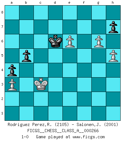 Last move : 1-0 2023 July 26 9:8:51 [Event "FICGS__CHESS__CLASS_A__000266"] [Site "FICGS"] [Date "2023.02.24"] [Round "1"] [White "Rodriguez Perez,Rene"] [Black "Salonen,Jukka"] [Result "1-0"] [WhiteElo "2105"] [BlackElo "2001"] 1.e4 e5 2.Nf3 Nc6 3.Bb5 a6 4.Bxc6 dxc6 5.O-O f6 6.d4 exd4 7.Nxd4 c5 8.Ne2 Qxd1 9.Rxd1 Bd7 10.Be3 O-O-O 11.Nbc3 Bd6 12.Bf4 Be6 13.Rd2 Ne7 14.Rad1 Bxf4 15.Nxf4 Rxd2 16.Rxd2 Bf7 17.Nfd5 Nc6 18.Ne3 Rd8 19.Rxd8+ Kxd8 20.f3 Kd7 21.Kf2 Be6 22.h4 Kd6 23.f4 Nd4 24.g4 b5 25.a3 Bc8 26.Ne2 Ke7 27.Nxd4 cxd4 28.Nf5+ Bxf5 29.gxf5 a5 30.b4 a4 31.Ke2 Kd6 32.h5 c5 33.bxc5+ Kxc5 34.e5 Kc6 35.Kd2 fxe5 36.fxe5 Kd5 37.e6 Kd6 38.c3 dxc3+ 39.Kxc3 g5 40.fxg6 1-0 Follow this game move after move (download)Openings teach you openings. Endgames teach you chess ! (Stephan Gerzadowicz) Charakterschwächen offenbaren sich normalerweise während einer Schachpartie. (Garry Kasparov) Debes de llevar a tu oponente hacia un profundo y obscuro bosque donde 2+2=5, y el camino que conduce a la salida es suficientemente ancho para solamente uno. (Mikhail Tal) Shah mat. Le roi est mort. Cri de fierté d'un joueur venant de terrasser son adversaire, courtoisement, sans effusion de sang. You must do what you feel is right... of course. (Obi-Wan Kenobi in Star Wars ep.4)