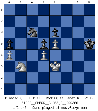 Last move : 1/2-1/2 2023 December 9 10:6:36 [Event "FICGS__CHESS__CLASS_A__000266"] [Site "FICGS"] [Date "2023.02.24"] [Round "1"] [White "Ploscaru,Stelian"] [Black "Rodriguez Perez,Rene"] [Result "1/2-1/2"] [WhiteElo "2197"] [BlackElo "2105"] 1.e4 e6 2.d4 d5 3.Nc3 Nf6 4.e5 Nfd7 5.f4 c5 6.Nf3 a6 7.Be3 Nc6 8.Qd2 b5 9.a3 Qb6 10.Ne2 Qc7 11.Ng3 Bb7 12.Bd3 Be7 13.c3 cxd4 14.cxd4 Qa5 15.f5 O-O 16.O-O Qxd2 17.Bxd2 b4 18.fxe6 fxe6 19.Ne2 bxa3 20.bxa3 Rfb8 21.Bg5 h6 22.Bxe7 Nxe7 23.Nf4 Nf8 24.Rfb1 a5 25.h4 Bc6 26.Kf2 Be8 27.h5 g5 28.hxg6 Bxg6 29.a4 Kf7 30.g4 Rxb1 31.Rxb1 Rc8 32.Nxg6 Nfxg6 33.Rb7 Nf4 34.Bf1 Nfg6 35.Bb5 Rc2+ 36.Kg3 Rc3 37.Rb8 Rc8 38.Rxc8 Nxc8 39.Nd2 Na7 40.Bd3 Kg7 41.Kf3 Ne7 42.Nb3 Nac6 43.Bb5 Kg6 44.Kf4 h5 45.gxh5+ Kxh5 46.Bxc6 Nxc6 47.Ke3 1/2-1/2 Follow this game move after move (download)Everything is in a state of flux, and this includes the world of Chess. (Mikhail Botvinnik) Bobby Fischer ist kein Vorbild für die heutige Jugend. (Viktor Kortschnoi) Robert Fischer es la ley hacia si mismo. (Larry Evans) Les pièces de l'échiquier étaient impitoyables. Elles le retenaient, elles l'absorbaient. Il y avait de l'horreur en cela, mais aussi une harmonie unique. Car, qu'y a-t-il dans le monde, à part les échecs ? (V. Nabokov) When you stop learning you start dying. (Scott Adams)