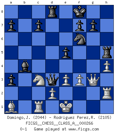 Last move : 0-1 2023 September 15 20:27:46 [Event "FICGS__CHESS__CLASS_A__000266"] [Site "FICGS"] [Date "2023.02.24"] [Round "1"] [White "Domingo,Jordi"] [Black "Rodriguez Perez,Rene"] [Result "0-1"] [WhiteElo "2044"] [BlackElo "2105"] 1.g4 d5 2.Bg2 e5 3.c4 dxc4 4.Nc3 h5 5.Nf3 Nc6 6.gxh5 Rxh5 7.h4 Qd7 8.b3 Nf6 9.bxc4 Qg4 10.Bh3 Qxc4 11.Bxc8 Rxc8 12.Rb1 b6 13.Bb2 Nd4 14.e3 Nxf3+ 15.Qxf3 Rd8 16.Qe2 Qe6 17.Rc1 Bc5 18.a4 Qf5 19.f3 Kf8 20.a5 bxa5 21.Qg2 Bb4 22.Ba1 a4 23.Qg3 a3 24.Rh2 Qd3 0-1 Follow this game move after move (download)It is not enough to be a good player... you must also play well. (Siegbert Tarrasch) Es ist schade, dass viele Schachsportler vergessen, wie wichtig Auftreten und angemessene Kleidung sind. (Alexandra Kosteniuk) Si un gobernante no entiende al Ajedrez, ¿como puede governar él un reinado?. (El Rey Khusros II) Les échecs c'est le défi de l'alpiniste, toujours plus haut, prêt à tout pour monter à l'assaut du Roi ennemi. Les échecs, c'est de la musique en mouvement, un ballet majestueux pour les yeux. C'est de la poésie composée par les fantômes du passé qui au même titre que Rimbaud ou Verlaine méritent notre admiration. Les échecs, c'est de la peinture ou le moindre mouvement modifie le tableau pour en faire un Picasso ou un Van Gogh. Les échecs, c'est tout et rien, c'est la vie et la mort. Jjulie33 sur le forum de France-Echecs. If we knew what we were doing, we would not call it research. (Albert Einstein)
