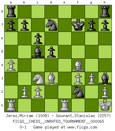 Last move : 0-1 2023 May 19 7:5:43 [Event "FICGS__CHESS__UNRATED_TOURNAMENT__000065"] [Site "FICGS"] [Date "2023.02.26"] [Round "1"] [White "Jerez,Miriam"] [Black "Gounant,Stanislas"] [Result "0-1"] [WhiteElo "1008"] [BlackElo "2257"] 1.e4 e5 2.Nf3 f5 3.g3 fxe4 4.Nxe5 Nf6 5.Nc3 d6 6.Nc4 d5 7.Ne5 Qe7 8.d4 exd3 9.Bxd3 Qxe5+ 10.Qe2 Qxe2+ 11.Bxe2 c6 12.O-O Bf5 13.Bf4 Nbd7 14.Bd3 Bh3 15.Rfe1+ Kf7 16.a4 Ng4 17.f3 Bc5+ 18.Kh1 Nf2+ 0-1 Follow this game move after move (download)During a Chess competition a Chessmaster should be a combination of a beast of prey and a monk. (Alexander Alekhine) Ich habe kein Problem mit Frauen, sondern nur mit dem Niveau ihres Schachspiels (Judith Polgar) Fischer deseaba darle a los Rusos una sopa de su propia medicina. (Larry Evans) Le génie consiste à savoir transgresser les règles au moment opportun. (Teichmann) Gambling : The sure way of getting nothing from something. (Wilson Mizner)