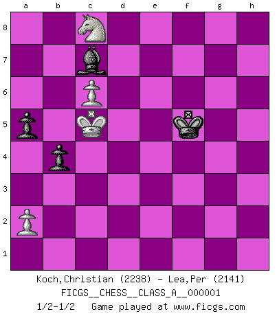 Last move : 1/2-1/2 2006 October 17 13:21:40 [Event "FICGS__CHESS__CLASS_A__000001"] [Site "FICGS"] [Date "2006.04.08"] [Round "1"] [White "Koch,Christian"] [Black "Lea,Per"] [Result "1/2-1/2"] [WhiteElo "2238"] [BlackElo "2141"] 1.e4 e5 2.Nf3 Nc6 3.Bb5 a6 4.Bxc6 dxc6 5.O-O Bg4 6.h3 h5 7.d3 Qf6 8.Nbd2 Ne7 9.Re1 Ng6 10.d4 Bd6 11.hxg4 hxg4 12.Nh2 Rxh2 13.Qxg4 Qh4 14.Qxh4 Rxh4 15.Nf3 Rh5 16.Be3 f6 17.g3 Kf7 18.Rad1 Rah8 19.Kg2 exd4 20.Bxd4 c5 21.Bc3 b5 22.b3 b4 23.Bb2 Ke6 24.Re3 Ne5 25.Bxe5 Bxe5 26.Red3 g5 27.Rd7 Bd6 28.Rg7 R5h7 29.Rxh7 Rxh7 30.Rd5 Re7 31.Ne1 Kf7 32.Kf3 Re5 33.Rxe5 Bxe5 34.Kg4 Ke6 35.Nd3 Bd4 36.f4 gxf4 37.gxf4 c6 38.Nc1 Bb2 39.Ne2 Ba1 40.Ng3 Bc3 41.Nf1 c4 42.Ne3 cxb3 43.cxb3 Bd4 44.Nc4 c5 45.f5+ Ke7 46.Kf4 Bc3 47.e5 fxe5+ 48.Nxe5 Ba1 49.Nd3 Kd6 50.Kg5 a5 51.f6 c4 52.bxc4 Ke6 53.Nc5+ Kf7 54.Kf5 Bxf6 55.Ke4 Bh4 56.Kd5 Kf6 57.Nd7+ Kf5 58.Nb6 Bd8 59.c5 Kf4 60.Kc4 Ke4 61.Nd7 Ke3 62.Nb8 Ke4 63.Nc6 Bc7 64.Na7 Kf5 65.Nc8 Bd8 66.Na7 Bc7 67.Nc8 Bd8 68.c6 Bc7 69.Kc5 1/2-1/2 Ruy Lopez : Exchange variation, Alapin gambit Kingside Castling by player White (move 5) 10 pieces endgame at move 48 : White KNPPP , Black KBPPP WHITE : King + 1 Knight 3 Pawns BLACK : King + 1 Bishop 3 Pawns 9 pieces endgame at move 52 : White KNPPP , Black KBPP WHITE : King + 1 Knight 3 Pawns BLACK : King + 1 Bishop 2 Pawns 8 pieces endgame at move 54 : White KNPP , Black KBPP WHITE : King + 1 Knight 2 Pawns BLACK : King + 1 Bishop 2 Pawns This chess game ended in a draw. Follow this game move after move (download)I thought the most common mistake [in chess] was the first one: Learning the game :P (Garvin Gray, FICGS forum) Als er Schachweltmeister wurde ließ er praktisch alle stärksten Sovietspieler für sich arbeiten. Wenn ein auch nur mittelmässiger Meister ein Spezialist für eine bestimmte Eröffnung war, wurde er von Karpov gerufen. Das wurde alles geheim gehalten. (Mikhail Moiseyevich Botvinik) No hay precio que sea tan grande por la cabellera del Rey enemigo. (Koblentz) A chaque perte on perd un peu de soi. (Joël Lautier) Computers have lots of memory but no imagination. (Anonymous)