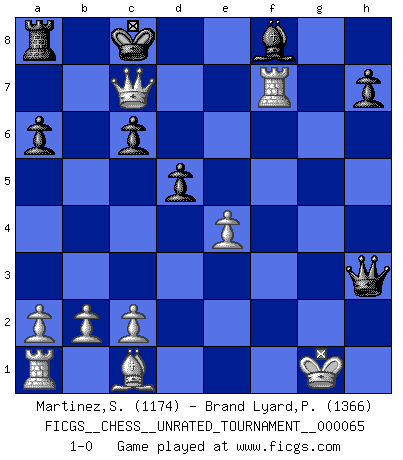 Last move : 1-0 2023 May 15 19:11:19 [Event "FICGS__CHESS__UNRATED_TOURNAMENT__000065"] [Site "FICGS"] [Date "2023.02.26"] [Round "1"] [White "Martinez,Silvio"] [Black "Brand Lyard,Paul"] [Result "1-0"] [WhiteElo "1174"] [BlackElo "1366"] 1.e4 e5 2.Nf3 Nc6 3.Nc3 d6 4.d4 Bg4 5.h3 Bxf3 6.Qxf3 exd4 7.Nd5 Nf6 8.Nxf6+ gxf6 9.Bb5 Qd7 10.Qxf6 Rg8 11.O-O a6 12.Bxc6 bxc6 13.Qxd4 Qxh3 14.g3 Rxg3+ 15.fxg3 Qxg3+ 16.Kh1 Qh3+ 17.Kg1 d5 18.Qe5+ Kd7 19.Rxf7+ Kc8 20.Qxc7+ 1-0 Follow this game move after move (download)Chess is a part of culture and if a culture is declining then Chess too will decline. (Mikhail Botvinnik) Jeder weiß, dass Gasprom Putins persönliches Machtinstrument ist. Die Firma wird vom Kreml aus geleitet und wird schon deshalb nie transparent sein. (Garry Kasparov) Aquel que ve no otra dirección en el juego que la de dar Jaque Mate a su oponente, nunca será un buen jugador de Ajedrez. (Euwe) La vérité est comme le meilleur coup aux échecs : elle existe, mais il faut la chercher. (Arturo Perez-Reverte) If you know the enemy and know yourself you need not fear the results of a hundred battles. (Sun Tzu)