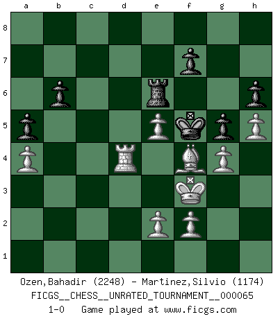 Last move : 1-0 2023 April 5 10:19:4 [Event "FICGS__CHESS__UNRATED_TOURNAMENT__000065"] [Site "FICGS"] [Date "2023.02.26"] [Round "1"] [White "Ozen,Bahadir"] [Black "Martinez,Silvio"] [Result "1-0"] [WhiteElo "2248"] [BlackElo "1174"] 1.g3 d5 2.Nf3 Nf6 3.Bg2 Nc6 4.d4 e6 5.O-O b6 6.c4 Bb7 7.cxd5 exd5 8.Nc3 Bb4 9.Ne5 Bxc3 10.bxc3 Ne4 11.c4 Nxe5 12.dxe5 O-O 13.Qc2 Re8 14.cxd5 Bxd5 15.Bxe4 Bxe4 16.Qxe4 c5 17.Bf4 Qd4 18.Qxd4 cxd4 19.Rfd1 Rad8 20.Rac1 h6 21.h4 Rd7 22.Kg2 Kh7 23.Rc4 Re6 24.R1xd4 Rxd4 25.Rxd4 a5 26.a4 Kg6 27.Kf3 Kf5 28.h5 g5 29.g4+ 1-0 Follow this game move after move (download)Of Chess it has been said that life is not long enough for it, but that is the fault of life, not Chess. (William Ewart Napier) Schach ist eine Sache der genauen Beurteilung, wann man zuschlagen und wann man sich ducken muss. (Robert James Fischer) Robert Fischer es la ley hacia si mismo. (Larry Evans) Aux échecs, l'amour-propre est satisfait quand on remporte la victoire, mais il n'y a pas de honte à être battu. (Benjamin Franklin) The man who strikes first admits that his ideas have given out. (Chinese proverb)