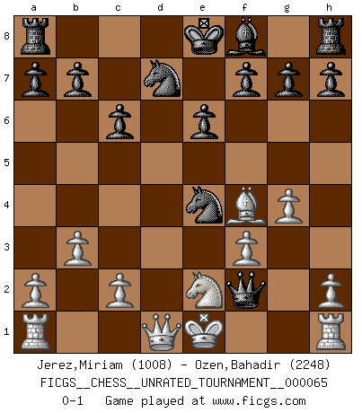 Last move : 0-1 2023 March 13 8:23:17 [Event "FICGS__CHESS__UNRATED_TOURNAMENT__000065"] [Site "FICGS"] [Date "2023.02.26"] [Round "1"] [White "Jerez,Miriam"] [Black "Ozen,Bahadir"] [Result "0-1"] [WhiteElo "1008"] [BlackElo "2248"] 1.e4 c6 2.d4 d5 3.Nc3 dxe4 4.Nxe4 Bf5 5.f3 e6 6.Bd3 Qxd4 7.Ne2 Qb6 8.g4 Bxe4 9.Bxe4 Nf6 10.Bg5 Nbd7 11.b3 Nxe4 12.Bf4 Qf2+ 0-1 Follow this game move after move (download)Look at Garry Kasparov. After he loses, invariably he wins the next game. He just kills the next guy. That's something that we have to learn to be able to do. (Maurice Ashley) Deine Wertungszahl - vorausgesetzt einige Jahre schachliche Anstrengung - entspricht etwa dem zehnfachen Deines IQ plus 1000. (Jonathan Levitt) Por tratar de evitar la pérdida de una pieza, muchas personas han perdido una partida de Ajedrez. (Savielly Tartakover) Horreur, mais aussi harmonie suprême : qu'y avait-il en effet au monde en dehors des échecs ? Le brouillard, l'inconnu, le non-être... (Vladimir Nabokov) You can't play chess if you're groggy from pills. (Anatoly Karpov)
