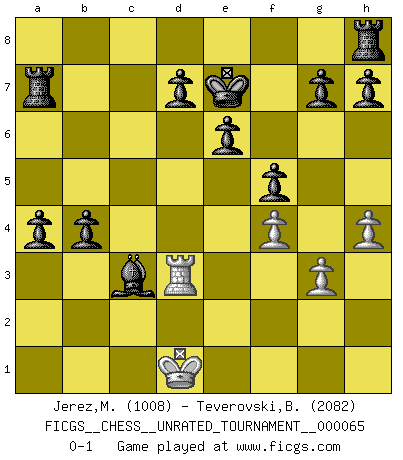 Last move : 0-1 2023 June 24 22:3:20 [Event "FICGS__CHESS__UNRATED_TOURNAMENT__000065"] [Site "FICGS"] [Date "2023.02.26"] [Round "1"] [White "Jerez,Miriam"] [Black "Teverovski,Bogoljub"] [Result "0-1"] [WhiteElo "1008"] [BlackElo "2082"] 1.e4 c5 2.c4 e6 3.Nf3 a6 4.Nc3 Qc7 5.g3 Nc6 6.Bg2 Bd6 7.d4 cxd4 8.Nxd4 Nge7 9.O-O Nxd4 10.Qxd4 Be5 11.Qd3 Nc6 12.a3 Na5 13.b4 Qxc4 14.Qxc4 Nxc4 15.Re1 Bxc3 16.Bb2 Bxb2 17.Rad1 Bxa3 18.Rd4 b5 19.e5 Ra7 20.h4 Bxb4 21.Rc1 Ke7 22.Kh2 Bb7 23.Rb1 Bxg2 24.Kxg2 Bc3 25.Re4 Nd2 26.Rbe1 Nxe4 27.Rxe4 f5 28.Re3 b4 29.Kf1 a5 30.Ke2 Bd4 31.Rd3 Bxe5 32.f4 Bc3 33.Kd1 a4 0-1 Follow this game move after move (download)It's just you and your opponent at the board and you're trying to prove something. (Bobby Fischer) Ich glaube nicht an Psychologie, ich glaube an gute Züge. (Robert James Fischer) Bobby es la celebridad menos entendida y malinterpretada que camina el la faz de esta tierra. (Yasser Seirawan) Des idées, des idées, j'en ai cent, j'en ai mille. Des bonnes, des mauvaises, applicables, irréalisables... Il suffit de faire le tri ! (Roos) Who needs drugs and alcohol if he can play Big Chess at FICGS ? (Heinz-Georg Lehnhoff)