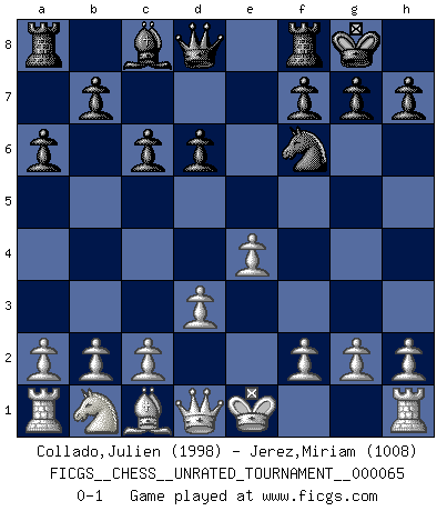 Last move : 0-1 2023 April 17 2:23:30 [Event "FICGS__CHESS__UNRATED_TOURNAMENT__000065"] [Site "FICGS"] [Date "2023.02.26"] [Round "1"] [White "Collado,Julien"] [Black "Jerez,Miriam"] [Result "0-1"] [WhiteElo "1998"] [BlackElo "1008"] 1.e4 e5 2.Nf3 Nc6 3.Bb5 Nf6 4.d3 a6 5.Bxc6 dxc6 6.Nxe5 Bd6 7.Nc4 O-O 8.Nxd6 cxd6 0-1 This chess game has been lost on time (started : 2023.02.26 19:9:21) Follow this game move after move (download)Avoid the crowd. Do your own thinking independently. Be the Chess player, not the Chess piece. (Ralph Charell) Die meiste Zeit treffe ich auf Gegner, die meine Enkel sein könnten. Ich bin da, um ihnen zu zeigen, dass sie von mir noch einiges lernen können. (Viktor Kortschnoi) Un mal plan es mejor que no tener ningún plan. (Frank Marshall) Les échecs c'est le défi de l'alpiniste, toujours plus haut, prêt à tout pour monter à l'assaut du Roi ennemi. Les échecs, c'est de la musique en mouvement, un ballet majestueux pour les yeux. C'est de la poésie composée par les fantômes du passé qui au même titre que Rimbaud ou Verlaine méritent notre admiration. Les échecs, c'est de la peinture ou le moindre mouvement modifie le tableau pour en faire un Picasso ou un Van Gogh. Les échecs, c'est tout et rien, c'est la vie et la mort. Jjulie33 sur le forum de France-Echecs. To err is human, to shift the blame on someone else is tactical. (Mladen Jankovic)