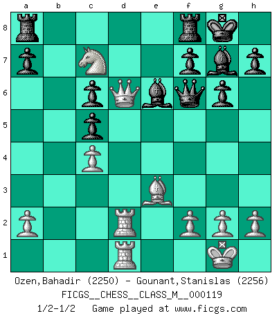 Last move : 1/2-1/2 2023 March 16 18:44:57 [Event "FICGS__CHESS__CLASS_M__000119"] [Site "FICGS"] [Date "2023.03.04"] [Round "1"] [White "Ozen,Bahadir"] [Black "Gounant,Stanislas"] [Result "1/2-1/2"] [WhiteElo "2250"] [BlackElo "2256"] 1.d4 Nf6 2.c4 g6 3.Nc3 Bg7 4.e4 d6 5.Nf3 O-O 6.Be2 e5 7.O-O Na6 8.Be3 Qe7 9.Qc2 exd4 10.Nxd4 c5 11.Ndb5 Nb4 12.Qd2 Nxe4 13.Nxe4 Qxe4 14.Rad1 Qc2 15.Bf3 Qxb2 16.Qxd6 Be6 17.Rd2 Qf6 18.Rfd1 Nc6 19.Bxc6 bxc6 20.Nc7 1/2-1/2 Follow this game move after move (download)The mistakes are there, waiting to be made. (Savielly Tartakower) Sitze auf Deine Hände. (Siegbert Tarrasch) En la vida, como en el Ajedrez, los Peones propios obstruyen nuestro camino. La gran fortuna de un hombre, su comodidad, placer, hijos, libros, que deberían ayudarle a ganar, con mucha frecuencia lo ponen en Jaque Mate. (Charles Buxton) Les échecs, c'est la lutte contre l'erreur. (Johannes Zukertort) I couldn't make any sense out of what this particular thread is about. It sounds like R2 D2 computer speaking. A space fight ?!? Some 'command' problems in Moscow ? Some killers & narcotic addicts attacking some game & a god wannabe ?? (Dinesh De Silva, lost in a russian conflict in FICGS forum)