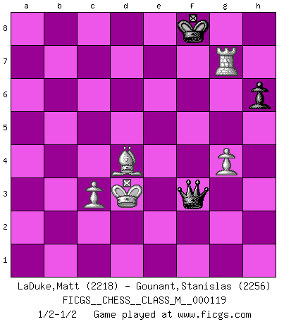 Last move : 1/2-1/2 2023 April 25 3:53:56 [Event "FICGS__CHESS__CLASS_M__000119"] [Site "FICGS"] [Date "2023.03.04"] [Round "1"] [White "LaDuke,Matt"] [Black "Gounant,Stanislas"] [Result "1/2-1/2"] [WhiteElo "2218"] [BlackElo "2256"] 1.e4 c5 2.Nf3 Nc6 3.Bb5 Nf6 4.e5 Nd5 5.Nc3 Nc7 6.Bxc6 dxc6 7.d3 Ne6 8.O-O g6 9.Re1 Bg7 10.Ne4 b6 11.Bd2 h6 12.h3 a5 13.a3 a4 14.Qc1 Ba6 15.Bf4 c4 16.d4 c5 17.Rd1 cxd4 18.Nxd4 Qc8 19.Nxe6 Qxe6 20.Re1 Rd8 21.f3 g5 22.Bg3 b5 23.Qe3 O-O 24.Nc3 f5 25.exf6 Qxe3+ 26.Rxe3 exf6 27.Rae1 Rd2 28.Re7 Rf7 29.R7e2 Rxe2 30.Rxe2 Kh7 31.Re8 Rd7 32.Re6 Bb7 33.Rb6 Bc8 34.Rxb5 Rd2 35.Rb8 Bf5 36.Rb4 Rxc2 37.Bf2 Bf8 38.Rb6 Bxa3 39.Nxa4 Rc1+ 40.Kh2 c3 41.bxc3 Rc2 42.Be3 Re2 43.Bd4 Bc1 44.Kg1 Bf4 45.g4 Bd3 46.Nc5 Re1+ 47.Kg2 Re2+ 48.Kf1 Rd2 49.Nxd3 Rxd3 50.h4 gxh4 51.Rxf6 h3 52.Rxf4 Rd1+ 53.Ke2 h2 54.Rf7+ Kg8 55.Rg7+ Kf8 56.Kxd1 h1Q+ 57.Ke2 Qg2+ 58.Kd3 Qxf3+ 1/2-1/2 Follow this game move after move (download)After a bad opening, there is hope for the middle game. After a bad middle game, there is hope for the endgame. But once you are in the endgame, the moment of truth has arrived. (Edmar Mednis) Schach ist Kampf, hauptsächlich jedoch gegen die eigenen Fehler. (Savielly Grigorievitsch Tartakower) Los Peones son el alma de una partida de Ajedrez. (Francois Andre Danican Philidor) Soyez une menace à chaque fois que vous vous asseyez pour jouer. (Ken Smith) There are lots of people who mistake their imagination for their memory. (Josh Bilings)