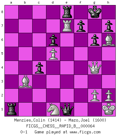 Last move : 0-1 2007 November 19 19:34:40 [Event "FICGS__CHESS__RAPID_B__000064"] [Site "FICGS"] [Date "2007.08.24"] [Round "1"] [White "Menzies,Colin"] [Black "Mazo,Joel"] [Result "0-1"] [WhiteElo "1414"] [BlackElo "1600"] 1.Nf3 Nf6 2.d4 g6 3.c4 c5 4.d5 b5 5.cxb5 a6 6.Nc3 Bg7 7.e4 axb5 8.e5 Ng4 9.Bxb5 Nxe5 10.O-O O-O 11.Nxe5 Bxe5 12.Bh6 Re8 13.Qf3 Bb7 14.Rfe1 Bh8 15.Bc4 d6 16.Re4 Nd7 17.Qh3 Bc8 18.Qf3 Ne5 19.Qe2 Bf5 20.Rf4 Qb6 21.Re1 Ng4 22.Rxg4 Bxg4 23.Qxg4 Qxb2 24.Nb5 Bc3 25.Re3 Rxa2 26.Nxc3 Qxf2+ 27.Kh1 Ra1+ 28.Nd1 Qd2 29.Bb3 c4 30.Rxe7 Qe1+ 0-1 Reti Opening Kingside Castling by player White (move 10) Kingside Castling by player Black (move 10) Player Black won this chess game. Follow this game move after move (download)A thorough understanding of the typical mating continuations makes the most complicated sacrificial combinations leading up to them not only not difficult, but almost a matter of course. (Siegbert Tarrasch) Es ist besser die Steine des Gegners zu opfern. (Savielly Grigorievitsch Tartakower) La vida es como el Ajedrez, con lucha, competición y eventos buenos y malos. (Benjamin Franklin) Les Echecs représentent une sphère d'idées créatrices basée sur la volonté des deux protagonistes. (Smyslov) There are more things in heaven and earth than practically anywhere else. (Unknown)