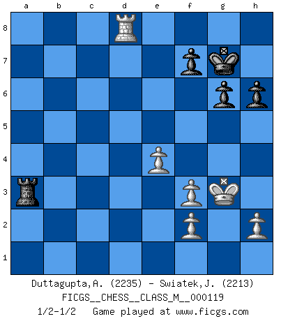 Last move : 1/2-1/2 2023 July 8 10:44:55 [Event "FICGS__CHESS__CLASS_M__000119"] [Site "FICGS"] [Date "2023.03.04"] [Round "1"] [White "Duttagupta,Aniruddha"] [Black "Swiatek,Janusz"] [Result "1/2-1/2"] [WhiteElo "2235"] [BlackElo "2213"] 1.d4 Nf6 2.c4 g6 3.Nc3 d5 4.Nf3 Bg7 5.cxd5 Nxd5 6.e4 Nxc3 7.bxc3 c5 8.Rb1 O-O 9.Be2 cxd4 10.cxd4 Qa5+ 11.Bd2 Qxa2 12.O-O Bg4 13.Bg5 h6 14.Be3 Nc6 15.d5 Ne5 16.Rxb7 a5 17.Rxe7 a4 18.Bd4 Nxf3+ 19.Bxf3 Bxf3 20.gxf3 Bxd4 21.Qxd4 a3 22.Kg2 Qb2 23.Qxb2 axb2 24.d6 Rfb8 25.Rb1 Kf8 26.Rc7 Ra1 27.Rxb2 Rxb2 28.Rc8+ Kg7 29.d7 Rd2 30.d8Q Rxd8 31.Rxd8 Ra4 32.Kg3 Ra3 1/2-1/2 Follow this game move after move (download)Different people feel differently about resigning. (Bobby Fischer) Als er Schachweltmeister wurde ließ er praktisch alle stärksten Sovietspieler für sich arbeiten. Wenn ein auch nur mittelmässiger Meister ein Spezialist für eine bestimmte Eröffnung war, wurde er von Karpov gerufen. Das wurde alles geheim gehalten. (Mikhail Moiseyevich Botvinik) No hay precio que sea tan grande por la cabellera del Rey enemigo. (Koblentz) Des idées, des idées, j'en ai cent, j'en ai mille. Des bonnes, des mauvaises, applicables, irréalisables... Il suffit de faire le tri ! (Roos) Whatever you do, don't be bored. This is absolutely the most exciting time we could have possibly hoped to be alive. And things are just starting. (From movie Waking life)