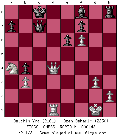 Last move : 1/2-1/2 2023 March 20 12:10:36 [Event "FICGS__CHESS__RAPID_M__000143"] [Site "FICGS"] [Date "2023.03.04"] [Round "1"] [White "Detchin,Yra"] [Black "Ozen,Bahadir"] [Result "1/2-1/2"] [WhiteElo "2181"] [BlackElo "2250"] 1.d4 Nf6 2.c4 e6 3.Nf3 d5 4.Nc3 c6 5.Bg5 dxc4 6.e4 b5 7.e5 h6 8.Bh4 g5 9.Nxg5 hxg5 10.Bxg5 Nbd7 11.g3 Bb7 12.exf6 Qb6 13.Bg2 O-O-O 14.O-O c5 15.d5 b4 16.Na4 Qb5 17.a3 Nb8 18.axb4 cxb4 19.Qg4 Bxd5 20.Rfc1 Nc6 21.Bxd5 Rxd5 22.Rxc4 Rxg5 23.Qd4 Kb8 24.Rxc6 Rxg3+ 25.fxg3 Qxc6 26.Rd1 Qc7 27.b3 Kc8 28.Qe3 Kb8 29.Qd4 Kc8 1/2-1/2 Follow this game move after move (download)It's always better to sacrifice your opponent's men. (Savielly Tartakover) Der Vorposten provoziert a) eine Basis für neue Angriffe und b) eine Schwächung der gegnerischen Widerstandskraft in der fraglichen Linie. (Aaron Nimzowitsch) Todos los jugadores de Ajedrez deberían tener un pasatiempo. (Savielly Tartakower) Je ne crois pas en la psychologie, je crois aux bons coups. (Robert Fischer) Men never do evil so completely and cheerfully as when they do it from religious conviction. (Blaise Pascal)