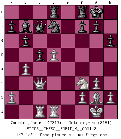 Last move : 1/2-1/2 2023 March 30 22:55:54 [Event "FICGS__CHESS__RAPID_M__000143"] [Site "FICGS"] [Date "2023.03.04"] [Round "1"] [White "Swiatek,Janusz"] [Black "Detchin,Yra"] [Result "1/2-1/2"] [WhiteElo "2213"] [BlackElo "2181"] 1.d4 Nf6 2.c4 e6 3.g3 Bb4+ 4.Bd2 Be7 5.Bg2 d5 6.Qc2 O-O 7.Nf3 c6 8.O-O b6 9.Rd1 Nbd7 10.b3 h6 11.Bc3 Bb7 12.Nbd2 Qc7 13.Rac1 Rac8 14.e4 dxe4 15.Nxe4 c5 16.Nxf6+ Bxf6 17.d5 exd5 18.cxd5 Rcd8 19.b4 Bxc3 20.Qxc3 1/2-1/2 Follow this game move after move (download)The tactician must know what to do whenever something needs doing; the strategist must know what to do when nothing needs doing. (Savielly Tartakover) Schach ist wie eine schöne Frau, zu der wir ständig zurückkehren, gleichviel, wie oft sie uns zurückweist. (Anonymous) Un juego de Ajedrez es un dialogo, una conversación entre un jugador y su oponente. Cada movimiento del oponente puede contener amenazas o tropiezos, pero un jugador no se puede defender de las amenazas o tomar ventaja de los tropiezos si es que no se pregunta a sí mismo: ¿Que es lo que mi oponente va a hacer después de cada movida?. (Bruce A. Moon) Plusieurs personnes se sont demandées comment Tal faisait pour gagner... En fait, c'est très simple ! Il met ses pièces au centre de l'échiquier et les sacrifie quelque part ! (David Bronstein) All politicians must be presumed guilty until they are proven innocent. (Dinesh De Silva)