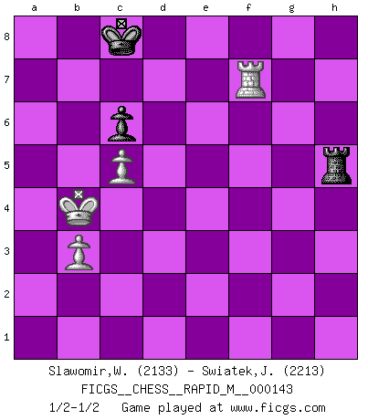 Last move : 1/2-1/2 2023 May 3 8:1:1 [Event "FICGS__CHESS__RAPID_M__000143"] [Site "FICGS"] [Date "2023.03.04"] [Round "1"] [White "Slawomir,Weglicki"] [Black "Swiatek,Janusz"] [Result "1/2-1/2"] [WhiteElo "2133"] [BlackElo "2213"] 1.e4 c6 2.d4 d5 3.Nd2 dxe4 4.Nxe4 Bf5 5.Ng3 Bg6 6.N1e2 Nf6 7.c3 Nbd7 8.h4 h6 9.Nf4 Bh7 10.Bd3 Bxd3 11.Nxd3 e6 12.Nh5 Qa5 13.Nxf6+ Nxf6 14.Qf3 Bd6 15.Bd2 O-O-O 16.Bf4 Qf5 17.Rh3 Bxf4 18.Qxf4 Qxf4 19.Nxf4 e5 20.dxe5 Rhe8 21.Nd3 Ng4 22.f4 g5 23.hxg5 hxg5 24.fxg5 Nxe5 25.O-O-O Rxd3 26.Rhxd3 Nxd3+ 27.Rxd3 Re2 28.Rg3 b5 29.Rg4 Rf2 30.g3 Rg2 31.a4 bxa4 32.Rxa4 Rxg3 33.Rxa7 Rg1+ 34.Kc2 Rxg5 35.Rxf7 Rh5 36.c4 Rh3 37.b3 Rh2+ 38.Kc3 Rh3+ 39.Kb4 Rh5 40.c5 1/2-1/2 Follow this game move after move (download)Chess is ruthless: you've got to be prepared to kill people. (Nigel Short) Wenn du nicht weißt was du tun sollst, warte bis dein Gegner eine Idee hat. Sie wird sicher schlecht sein. (Siegbert Tarrasch) El Ajedrez es un invernadero donde los frutos del carácter pueden madurar mas completamente que en la vida. (Edward Morgan Foster) Aux échecs, l'amour-propre est satisfait quand on remporte la victoire, mais il n'y a pas de honte à être battu. (Benjamin Franklin) Warrior pose battles inner weakness and wins focus. You see that there is no war within you. You're on your own side, and you are your own strength. (Terri Guillemets)
