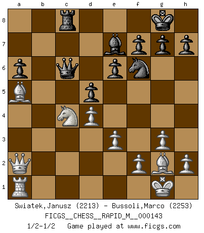 Last move : 1/2-1/2 2023 April 30 22:46:22 [Event "FICGS__CHESS__RAPID_M__000143"] [Site "FICGS"] [Date "2023.03.04"] [Round "1"] [White "Swiatek,Janusz"] [Black "Bussoli,Marco"] [Result "1/2-1/2"] [WhiteElo "2213"] [BlackElo "2253"] 1.d4 Nf6 2.c4 e6 3.g3 d5 4.Nf3 Bb4+ 5.Bd2 Be7 6.Bg2 c6 7.Qc2 b6 8.O-O Nbd7 9.cxd5 cxd5 10.Rc1 Bb7 11.Qd1 Rc8 12.Nc3 O-O 13.Bf4 Ne4 14.Nb5 a6 15.Rxc8 Bxc8 16.Bc7 Qe8 17.Nc3 Nxc3 18.bxc3 Bb7 19.Qb3 b5 20.Ba5 Qc8 21.a4 Bc6 22.axb5 Bxb5 23.e3 Qc6 24.Nd2 Nf6 25.Qa2 Rc8 26.c4 Bxc4 27.Nxc4 1/2-1/2 Follow this game move after move (download)It was clear to me that the vulnerable point of the American Grandmaster (Bobby Fischer) was in double-edged, hanging, irrational positions, where he often failed to find a win even in a won position. (Efim Geller) Je mehr ich von der FIDE weiss, um so weniger verstehe ich. (Alexander Kalifman) Si pudieramos observar el interior de la cabeza de un jugador de Ajedrez, encontraríamos ahí un mundo lleno de sentimientos, imágenes, ideas, emoción y pasión. (Alfred Binet) Le plus grand jeu de l'esprit jamais inventé, plus vous l'apprenez, plus vous y prenez du plaisir. (Garry Kasparov) Life is like internet, nothing interesting, but noone want to leave it. (Ilmars Cirulis)