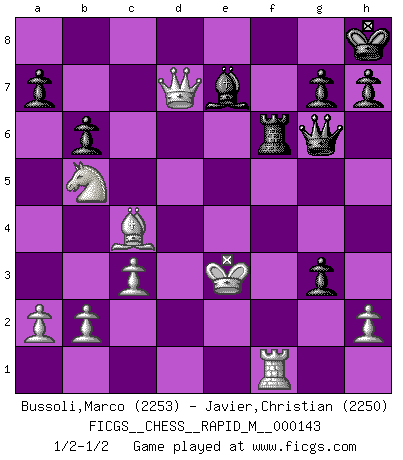 Last move : 1/2-1/2 2023 June 4 17:21:38 [Event "FICGS__CHESS__RAPID_M__000143"] [Site "FICGS"] [Date "2023.03.04"] [Round "1"] [White "Bussoli,Marco"] [Black "Javier,Christian"] [Result "1/2-1/2"] [WhiteElo "2253"] [BlackElo "2250"] 1.e4 e5 2.Nf3 Nc6 3.Bb5 Nf6 4.O-O Nxe4 5.Re1 Nd6 6.Nxe5 Nxe5 7.Bf1 Be7 8.Rxe5 O-O 9.d4 Bf6 10.Re2 b6 11.Re1 Bb7 12.c3 Bh4 13.Na3 Qf6 14.g3 Rae8 15.Re5 Rxe5 16.dxe5 Qxe5 17.Bf4 Qe4 18.f3 Qg6 19.Bd3 f5 20.Bxd6 cxd6 21.Kg2 Kh8 22.Nb5 Bd8 23.Bc4 f4 24.Qxd6 Bxf3+ 25.Kxf3 Rf6 26.Qxd7 fxg3 27.Ke3 Qg5+ 28.Kd3 Qg6+ 29.Ke3 Be7 30.Rf1 Qh6+ 31.Kd3 Qg6+ 32.Ke3 Qg5+ 33.Ke4 Qh4+ 34.Kd5 Qh5+ 35.Ke4 Qh4+ 36.Kd5 Qh5+ 37.Ke4 Qg6+ 38.Ke3 1/2-1/2 Follow this game move after move (download)Everything is in a state of flux, and this includes the world of Chess. (Mikhail Botvinnik) Um dein Spiel zu verbessern musst du zuallererst das Endspiel studieren, denn diese kann unabhängig studiert werden. Die Eröffnung und das Mittelspiel müssen immer in Bezug gesetzt werden zum Endspiel. (José Raúl Capablanca) La última cosa en que Fischer estaba interesado era en tonterías, siempre y cuando el Ajedrez estuviera involucrado. (Elie Agur) La tactique est l'élément le plus important du milieu de jeu. (Siegbert Tarrasch) A person who never made a mistake never tried anything new. (Albert Einstein)