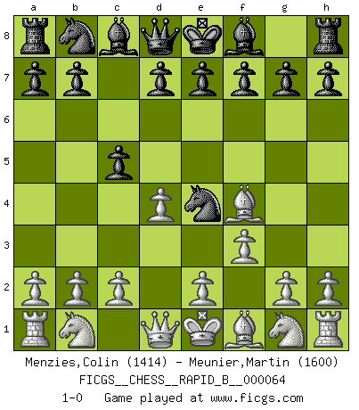 Last move : 1-0 2007 October 12 0:24:18 [Event "FICGS__CHESS__RAPID_B__000064"] [Site "FICGS"] [Date "2007.08.24"] [Round "1"] [White "Menzies,Colin"] [Black "Meunier,Martin"] [Result "1-0"] [WhiteElo "1414"] [BlackElo "1600"] 1.d4 Nf6 2.Bg5 Ne4 3.Bf4 c5 4.f3 1-0 This chess game has been lost on time (started : 2007.08.24 20:11:52) Trompowsky attack (Ruth, Opovcensky Opening) Player White won this chess game. Follow this game move after move (download)Chess is a sea in which a gnat may drink and an elephant may bathe. (Hindu proverb) Ich möchte Schüler heranbilden, die das Vermögen haben, selbst zu denken und Kritik zu üben. (Emanuel Lasker) Repentinamente, me resultaba obvio en mi analisis que yo había pasado por alto lo que Fischer había visto en el tablero con la mas grande facilidad. (Mikhail Botvinnik) Psychologiquement, tu dois avoir confiance en toi même, mais cette confiance doit être basée sur des faits. (Robert Fischer) Faith : not wanting to know what is true. (Friedrich Nietzsche)