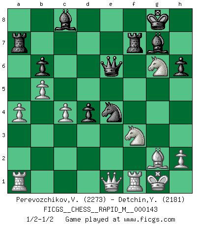 Last move : 1/2-1/2 2023 April 26 18:18:36 [Event "FICGS__CHESS__RAPID_M__000143"] [Site "FICGS"] [Date "2023.03.04"] [Round "1"] [White "Perevozchikov,Vjacheslav"] [Black "Detchin,Yra"] [Result "1/2-1/2"] [WhiteElo "2273"] [BlackElo "2181"] 1.Nf3 d5 2.g3 g6 3.Bg2 Bg7 4.O-O e5 5.d3 Ne7 6.c4 c6 7.e4 O-O 8.b4 d4 9.a4 c5 10.b5 a6 11.Nbd2 b6 12.Nh4 Ra7 13.f4 exf4 14.gxf4 Nd7 15.Ndf3 Qc7 16.f5 axb5 17.cxb5 c4 18.Bg5 Qc5 19.Qe1 h6 20.Bxe7 Qxe7 21.fxg6 Nc5 22.dxc4 Nxe4 23.gxf7+ Rxf7 24.Ng6 Qe6 1/2-1/2 Follow this game move after move (download)I played Chess with him and would have beaten him sometimes only he always took back his last move, and ran the game out differently. (Mark Twain) Wie gewinnt Tal? Er entwickelt alle seine Figuren in die Brettmitte und opfert sie dann irgendwo. (Robert James Fischer) En el Ajedrez, tal como es jugado por los Maestros, practicamente la suerte es eliminada. (Emanuel Lasker) Ne tendez aucun piège pour le plaisir ! Ne jouez rien dans l'espoir que l'adversaire réagisse de façon stupide ! Prenez toujours pour acquis que l'adversaire va trouver le meilleur coup ! Ne jouez jamais de coup dans l'espoir que l'adversaire ne voie pas la menace ! Chacun de vos coups doit améliorer la position d'une façon ou d'une autre. The beginning of wisdom is silence. The second step is listening. (Unknown)