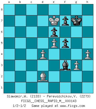 Last move : 1/2-1/2 2023 May 9 8:29:23 [Event "FICGS__CHESS__RAPID_M__000143"] [Site "FICGS"] [Date "2023.03.04"] [Round "1"] [White "Slawomir,Weglicki"] [Black "Perevozchikov,Vjacheslav"] [Result "1/2-1/2"] [WhiteElo "2133"] [BlackElo "2273"] 1.d4 Nf6 2.c4 g6 3.Nc3 d5 4.Nf3 Bg7 5.cxd5 Nxd5 6.e4 Nxc3 7.bxc3 c5 8.Be3 Qa5 9.Qd2 Nc6 10.Rb1 a6 11.Rc1 cxd4 12.cxd4 Qxd2+ 13.Kxd2 e6 14.h4 O-O 15.Bd3 h6 16.Rc5 Bd7 17.Rb1 b5 18.e5 Rac8 19.Nh2 Ne7 20.Rbc1 Rxc5 21.Rxc5 Bc6 22.f3 Bd5 23.Ng4 Bxa2 24.Nxh6+ Bxh6 25.Bxh6 Rc8 26.Rxc8+ Nxc8 27.Kc3 Ne7 28.Kb4 Nf5 29.Bxf5 gxf5 30.Ka5 Bc4 31.Bc1 Bf1 32.g3 Be2 33.Kxa6 Bxf3 34.Kxb5 Kh7 35.Kc5 Kg7 36.Kd6 Kg6 37.Ke7 Kg7 38.Bd2 1/2-1/2 Follow this game move after move (download)At this time Fischer is simply a level above all the best Chessplayers in the world. (John Jacobs) Obwohl ich vom Stil her kaum zu den Priestern der Schachkunst gezählt werde, halte ich Schach doch für eine Kunst. (Tigran Petrosjan) Nunca nadie ha ganado una partida de Ajedrez rindiendose. (Unknown) La solitude du joueur d'Echecs à l'approche du mat est semblable à celle du condamné. (Francis Szpiner) Life is pain my dear and anyone who says otherwise is selling something. (Princess Bride)