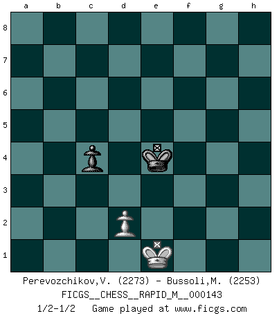Last move : 1/2-1/2 2023 July 3 18:56:58 [Event "FICGS__CHESS__RAPID_M__000143"] [Site "FICGS"] [Date "2023.03.04"] [Round "1"] [White "Perevozchikov,Vjacheslav"] [Black "Bussoli,Marco"] [Result "1/2-1/2"] [WhiteElo "2273"] [BlackElo "2253"] 1.Nf3 Nf6 2.c4 c5 3.g3 d5 4.cxd5 Nxd5 5.Bg2 Nc6 6.Nc3 Nc7 7.a3 e5 8.b4 f6 9.b5 Nd4 10.a4 Be6 11.Rb1 Nd5 12.O-O Qd7 13.Ba3 Nxf3+ 14.Bxf3 b6 15.Rb3 Rd8 16.Nxd5 Bxd5 17.Rd3 Qe6 18.Bb2 Be7 19.Bxd5 Rxd5 20.Qb3 Rd6 21.Qxe6 Rxe6 22.Bc3 e4 23.Rd5 Rd6 24.Rxd6 Bxd6 25.a5 Kd7 26.axb6 axb6 27.Ra1 Bb8 28.Ra6 Bc7 29.Ra4 Re8 30.Kg2 Kd6 31.f3 Kd5 32.Kf2 h5 33.e3 Re7 34.Ke2 f5 35.fxe4+ fxe4 36.Kd1 g6 37.Kc2 h4 38.gxh4 Bxh2 39.Kb3 Bg3 40.Ra8 c4+ 41.Kc2 Bxh4 42.Bd4 Re6 43.Rb8 Bf6 44.Bxb6 Be5 45.Rb7 Re8 46.Bc7 Re7 47.b6 Kc6 48.Ra7 Bxc7 49.Rxc7+ Rxc7 50.bxc7 Kxc7 51.Kc3 g5 52.Kd4 Kd6 53.Kxe4 g4 54.Kf4 Kd5 55.Kxg4 Ke4 56.Kg3 Kd3 57.e4 Kxe4 58.Kf2 Kd3 59.Ke1 Ke4 1/2-1/2 Follow this game move after move (download)In Fischer's hands, a slight theoretical advantage is as good a being a Queen ahead. (Isaac Kashdan) Wenn Dein Gegner dir ein Remis anbietet, versuch herauszufinden, weshalb er glaubt schlechter zu stehen. (Nigel Short) Un mal día en el Ajedrez, es mejor que cualquier buen día en el trabajo. (Anonymous) Ce qui est bien, c'est d'avoir tout un tas de pièces en prise : l'adversaire ne peut en prendre qu'une à la fois. Cité par Thierry Audin. Computers make it easier to do a lot of things, but most of the things they make it easier to do don't need to be done. (Andy Rooney)