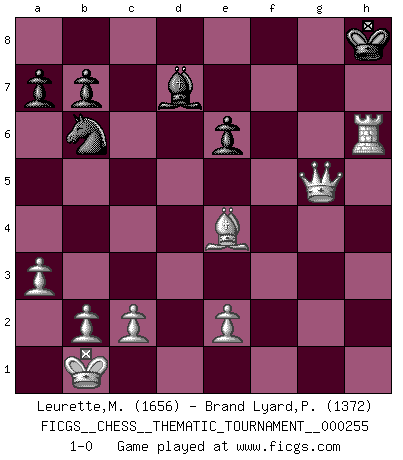 Last move : 1-0 2023 March 17 8:21:47 [Event "FICGS__CHESS__THEMATIC_TOURNAMENT__000255"] [Site "FICGS"] [Date "2023.03.08"] [Round "1"] [White "Leurette,Marc-Antoine"] [Black "Brand Lyard,Paul"] [Result "1-0"] [WhiteElo "1656"] [BlackElo "1372"] 1.d4 f5 2.Qd3 d5 3.g4 fxg4 4.Nc3 Nf6 5.Bg2 e6 6.Bf4 Bb4 7.a3 Bxc3+ 8.Qxc3 c6 9.Be5 Rf8 10.O-O-O Na6 11.h3 g6 12.Bxf6 Rxf6 13.hxg4 Rxf2 14.Bf3 Qg5+ 15.Kb1 h5 16.Nh3 Qh4 17.Nxf2 Qxf2 18.Qd3 Qg3 19.Qxg6+ Kd7 20.gxh5 Qxg6 21.hxg6 Kd6 22.g7 Bd7 23.Rh8 Rxh8 24.gxh8Q c5 25.Qe5+ Ke7 26.dxc5 Nxc5 27.Rxd5 Na4 28.Qd6+ Kf6 29.Rd4 Nb6 30.Rf4+ Kg5 31.Qe5+ Kg6 32.Be4+ Kh6 33.Rf6+ Kg7 34.Qg5+ Kh8 35.Rh6+ 1-0 Follow this game move after move (download)It is difficult to play against Einstein's theory --on his first loss to Fischer. (Mikhail Tal) Ich bin Weltmeister und muß mit niemandem irgend etwas diskutieren. (Viswanathan Anand) Los tropiezos estan todos ahí en el tablero, esperando que se cometan. (Savielly Tartakover) Les sacrifices démontrent seulement que quelqu'un a gaffé. (Savielly Tartacover) Lamb in skin of tiger, still fears the wolf. (Chinese proverb)