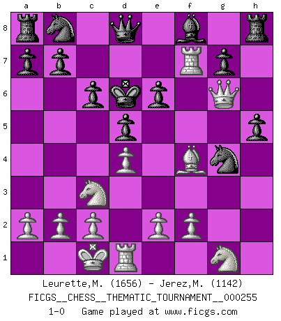 Last move : 1-0 2023 April 2 19:31:35 [Event "FICGS__CHESS__THEMATIC_TOURNAMENT__000255"] [Site "FICGS"] [Date "2023.03.08"] [Round "1"] [White "Leurette,Marc-Antoine"] [Black "Jerez,Miriam"] [Result "1-0"] [WhiteElo "1656"] [BlackElo "1142"] 1.d4 f5 2.Qd3 d5 3.g4 fxg4 4.Nc3 c6 5.Bd2 Nf6 6.h3 gxh3 7.Bxh3 Bxh3 8.Rxh3 e6 9.O-O-O Ng4 10.Rf3 h5 11.Qg6+ Kd7 12.Rf7+ Kd6 13.Bf4+ 1-0 Follow this game move after move (download)There's never before been a Chess player with such a thorough knowledge of the intricacies of the game and such an absolutely indomitable will to win. I think Bobby is the greatest player that ever lived. (Lisa Lane) Schach ist ein Kampf gegen den Fehler. (Johannes Herrman Zukertort) Tu no necesitas jugar muy bien, únicamente ayudar a tu oponenet a que juegue muy mal. (Genrikh Chepukaitis) Mais l'homme est une créature légère et illogique : semblable au joueur d'échecs, il n'aime que le processus du but à atteindre, non le but lui-même. (Dostoïevsky) It is not titles that honor men, but men that honor titles. (Niccolo Machiavelli)