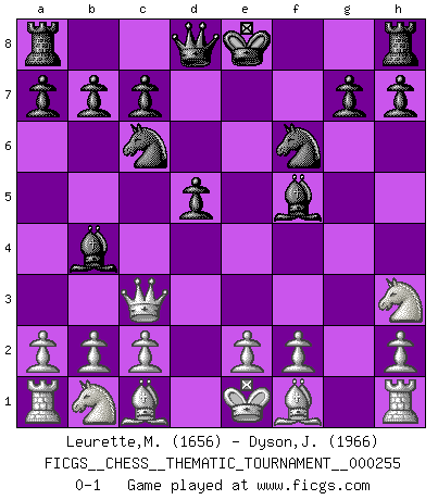 Last move : 0-1 2023 March 12 20:49:6 [Event "FICGS__CHESS__THEMATIC_TOURNAMENT__000255"] [Site "FICGS"] [Date "2023.03.08"] [Round "1"] [White "Leurette,Marc-Antoine"] [Black "Dyson,John"] [Result "0-1"] [WhiteElo "1656"] [BlackElo "1966"] 1.d4 f5 2.Qd3 d5 3.g4 e5 4.gxf5 exd4 5.Qxd4 Nc6 6.Qe3+ Be7 7.Nh3 Bxf5 8.Qd2 Nf6 9.Qc3 Bb4 0-1 Follow this game move after move (download)Excellence at Chess is one mark of a scheming mind. (Sir Arthur Conan Doyle) Ich habe Putins Aufstieg an die Macht beobachtet und seine Politik, die demokratischen Institutionen meines Landes zu zerstören. (Garry Kasparov) Juega la Apertura como un libro, el Juego Medio como un mago y los Finales como una máquina. (Spielmann) Je menace de comprendre la position. (Anonyme) If everyone is thinking alike, then somebody isn't thinking. (US General George S. Patton)
