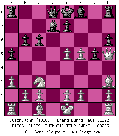 Last move : 1-0 2023 March 12 17:6:52 [Event "FICGS__CHESS__THEMATIC_TOURNAMENT__000255"] [Site "FICGS"] [Date "2023.03.08"] [Round "1"] [White "Dyson,John"] [Black "Brand Lyard,Paul"] [Result "1-0"] [WhiteElo "1966"] [BlackElo "1372"] 1.d4 f5 2.Qd3 d5 3.g4 Nc6 4.gxf5 Nf6 5.Bh3 b6 6.Nc3 Bd7 7.a3 a5 8.Nf3 h6 9.Ne5 Nxe5 10.dxe5 Nh5 11.Qxd5 c6 12.Qf3 g5 13.Qxh5+ 1-0 Follow this game move after move (download)Avoid the crowd. Do your own thinking independently. Be the Chess player, not the Chess piece. (Ralph Charell) Kein Großmeister ist normal. Sie unterscheiden sich nur im Ausmaß Ihrer Verrücktheit. (Viktor Kortschnoi) No volvere nunca a jugar contigo. Has insultado a mi amigo. - cuando un oponente se maldijo por una mala jugada (Miguel Najdorf) Le plus grand jeu de l'esprit jamais inventé, plus vous l'apprenez, plus vous y prenez du plaisir. (Garry Kasparov) You cannot beat a roulette table unless you steal money from it. (Albert Einstein)