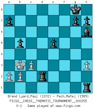 Last move : 0-1 2023 July 19 7:1:21 [Event "FICGS__CHESS__THEMATIC_TOURNAMENT__000255"] [Site "FICGS"] [Date "2023.03.08"] [Round "1"] [White "Brand Lyard,Paul"] [Black "Pech,Matej"] [Result "0-1"] [WhiteElo "1372"] [BlackElo "1989"] 1.d4 f5 2.Qd3 d5 3.g4 fxg4 4.Bf4 c5 5.Bxb8 Rxb8 6.dxc5 Nf6 7.Bg2 Bd7 8.Bxd5 Nxd5 9.Qxd5 Bc6 10.Qxd8+ Rxd8 11.f3 e5 12.e4 Bxc5 13.Ne2 gxf3 14.Nec3 O-O 15.Nd2 Rf4 16.O-O-O f2 17.h3 b5 18.Ne2 Rf7 19.Ng3 Be3 20.Ngf1 Bh6 21.c3 Bxe4 22.Ng3 Bxh1 23.Nxh1 f1Q 24.Rxf1 Rxf1+ 25.Kc2 Rxd2+ 26.Kb3 Rxh1 0-1 Follow this game move after move (download)Fischer is under obligation to nobody. (Joseph Platz) Ein unbeabsichtigtes Patt ist der Gipfel der Dummheit. (Anonymous) Nunca nadie ha ganado una partida de Ajedrez rindiendose. (Unknown) Si je n'étais pas joueur d'échecs, je serais le meilleur dans quelque chose d'autre. (Anatoli Karpov) Art is the triumph over chaos. (John Cheever)