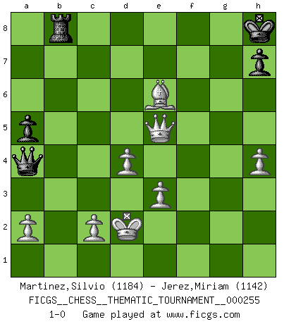 Last move : 1-0 2023 May 21 19:57:6 [Event "FICGS__CHESS__THEMATIC_TOURNAMENT__000255"] [Site "FICGS"] [Date "2023.03.08"] [Round "1"] [White "Martinez,Silvio"] [Black "Jerez,Miriam"] [Result "1-0"] [WhiteElo "1184"] [BlackElo "1142"] 1.d4 f5 2.Qd3 d5 3.g4 fxg4 4.Nc3 e6 5.f3 gxf3 6.Nxf3 Nc6 7.Bd2 Nf6 8.O-O-O b6 9.Rg1 a5 10.Ne5 Nxe5 11.Qe3 Nc4 12.Qf2 e5 13.b3 Ba3+ 14.Kb1 e4 15.Nb5 e3 16.Bxe3 Bd7 17.Rxg7 Rg8 18.Rxg8+ Nxg8 19.Bf4 Bxb5 20.bxc4 Bxc4 21.e3 Nf6 22.Bg5 Be7 23.h4 Qd6 24.Kb2 Ng4 25.Qf3 Qb4+ 26.Kc1 Qa3+ 27.Kd2 Rd8 28.Qxg4 Bxg5 29.Qh5+ Ke7 30.Qxg5+ Kd7 31.Bh3+ Ke8 32.Qe5+ Qe7 33.Qh5+ Qf7 34.Qe5+ Kf8 35.Rf1 Bxf1 36.Qh8+ Qg8 37.Qf6+ Ke8 38.Qxf1 c5 39.Qb5+ Ke7 40.Qxb6 Rb8 41.Qxc5+ Kf6 42.Qd6+ Kg7 43.Be6 Qe8 44.Qxd5 Qa4 45.Qg5+ Kh8 46.Qe5+ 1-0 Follow this game move after move (download)Chess is the art of analysis. (Mikhail Botvinnik) Bis jetzt ist Weiß einer wohlbekannten Analyse gefolgt. Aber jetzt begeht er einen schrecklichen Fehler: Er beginnt seinen eigenen Kopf zu benutzen. (Siegbert Tarrasch) Tu eres para mi la Reina en d8 y yo soy el Peón en d7!!. (GM Eduard Gufeld) Pour se monter efficace, un Cavalier a besoin d'avant-postes ! Les Cavaliers font les meilleurs bloqueurs de pions passés. Gambling : The sure way of getting nothing from something. (Wilson Mizner)