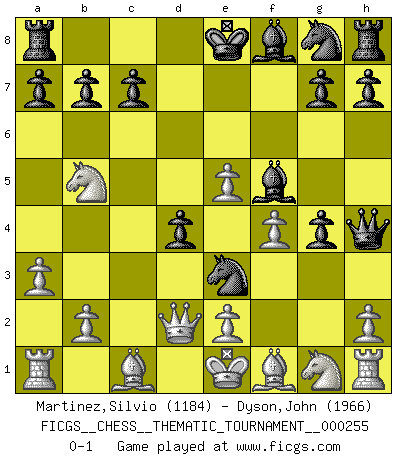 Last move : 0-1 2023 March 27 21:34:59 [Event "FICGS__CHESS__THEMATIC_TOURNAMENT__000255"] [Site "FICGS"] [Date "2023.03.08"] [Round "1"] [White "Martinez,Silvio"] [Black "Dyson,John"] [Result "0-1"] [WhiteElo "1184"] [BlackElo "1966"] 1.d4 f5 2.Qd3 d5 3.g4 e5 4.dxe5 Nc6 5.f4 fxg4 6.Nc3 Nb4 7.Qd2 Bf5 8.a3 Nxc2+ 9.Kd1 d4 10.Nb5 Ne3+ 11.Ke1 Qh4+ 0-1 Follow this game move after move (download)The blunders are all there on the board, waiting to be made. (Savielly Tartakover) Kombinieren und Schwarzhandel gehören verboten. (Savielly Grigorievitsch Tartakower) EL Ajedrez es como la vida. (Boris Spassky) Dieu déplace le joueur, et celui-ci la pièce. Quel Dieu derrière Dieu commence donc la trame ? Arturo Perez-Reverte (prix de littérature policière 1993). Locking firmely the window serves nothing, only small thiefs pass through there, the big thiefs enter through the front door. (Luc-Olivier Leclerc)