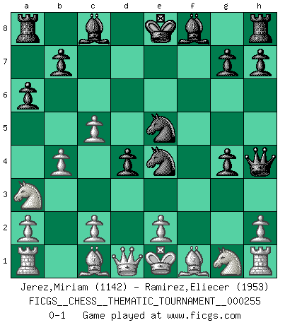 Last move : 0-1 2023 May 25 11:6:30 [Event "FICGS__CHESS__THEMATIC_TOURNAMENT__000255"] [Site "FICGS"] [Date "2023.03.08"] [Round "1"] [White "Jerez,Miriam"] [Black "Ramirez,Eliecer"] [Result "0-1"] [WhiteElo "1142"] [BlackElo "1953"] 1.d4 f5 2.Qd3 d5 3.g4 fxg4 4.Nc3 Nf6 5.f3 c5 6.dxc5 Nc6 7.f4 d4 8.Nb5 a6 9.Na3 e5 10.fxe5 Nxe5 11.Qd1 Ne4 12.b4 Qh4+ 0-1 Follow this game move after move (download)It is the aim of the modern school, not to treat every position according to one general law, but according to the principle inherent in the position. (Richard Reti) Im Leben werden Partien nie so unstrittig gewonnen wie im Spiel (Emanuel Lasker) A través de las casillas del tablero, los Indios explican el movimiento del tiempo y la edad, las influencias mas altas que controlan el mundo y los lazos que vinculan al Ajedrez con el alma humana. (Al-Masudi) Le système Elo représente seulement une moyenne. Il est simplement un indicateur de votre stabilité. (Anatoli Karpov) Creativity is allowing yourself to make mistakes. Art is knowing which ones to keep. (Scott Adams)