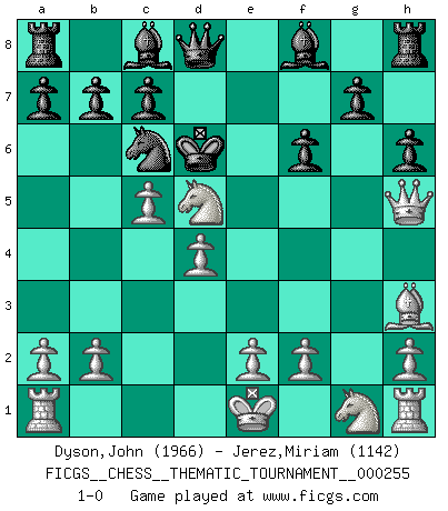 Last move : 1-0 2023 March 20 0:26:57 [Event "FICGS__CHESS__THEMATIC_TOURNAMENT__000255"] [Site "FICGS"] [Date "2023.03.08"] [Round "1"] [White "Dyson,John"] [Black "Jerez,Miriam"] [Result "1-0"] [WhiteElo "1966"] [BlackElo "1142"] 1.d4 f5 2.Qd3 d5 3.g4 fxg4 4.Nc3 Nf6 5.Bg5 h6 6.Qg6+ Kd7 7.Bxf6 exf6 8.Qxg4+ Ke8 9.Qh5+ Ke7 10.Nxd5+ Ke6 11.c4 Nc6 12.Bh3+ Kd6 13.c5+ 1-0 Follow this game move after move (download)I play correspondence chess because it is both art and science while chess is art only. (A player at FICGS) Die Jungen erwarten, dass Opa einfach umfällt. Dann aber kann Opa fünf Stunden lang Schach spielen und die jungen Gegner an die Wand drücken. (Viktor Kortschnoi) Estaba muy claro de que el punto vulnerable del Gran Maestro Americano (Bobby Fischer) radicaba en las posiciones de doble filo, colgantes, irracionales, donde el siempre falló en encontrar un triunfo aún en una posición de clara victoria. (Efim Geller) Ce qui est bien, c'est d'avoir tout un tas de pièces en prise : l'adversaire ne peut en prendre qu'une à la fois. Cité par Thierry Audin. Don't anthropomorphize computers - they hate it. (Anonymous)