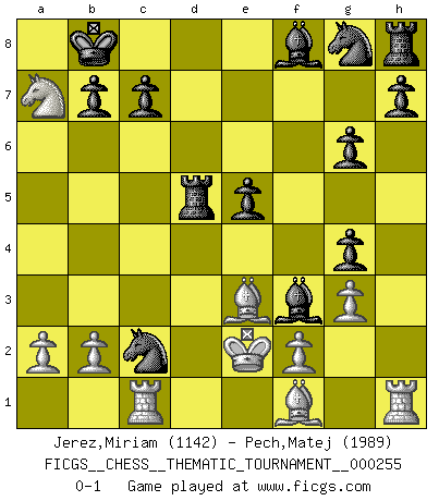 Last move : 0-1 2023 June 26 9:26:46 [Event "FICGS__CHESS__THEMATIC_TOURNAMENT__000255"] [Site "FICGS"] [Date "2023.03.08"] [Round "1"] [White "Jerez,Miriam"] [Black "Pech,Matej"] [Result "0-1"] [WhiteElo "1142"] [BlackElo "1989"] 1.d4 f5 2.Qd3 d5 3.g4 g6 4.Nc3 Nc6 5.Nf3 fxg4 6.Nh4 e5 7.e4 Qxh4 8.exd5 Nxd4 9.Nb5 Bf5 10.Qg3 Qxg3 11.hxg3 Nxc2+ 12.Kd1 O-O-O 13.Nxa7+ Kb8 14.Be3 Rxd5+ 15.Ke2 Be4 16.Rc1 Bf3+ 0-1 Follow this game move after move (download)Fischer is the strongest player in the world. In fact, the strongest player who ever lived. (Larry Evans) Schach ist wie eine schöne Frau, zu der wir ständig zurückkehren, gleichviel, wie oft sie uns zurückweist. (Anonymous) La única cosa que los jugadores de Ajedrez tienen en común, es el Ajedrez. (Lodewijk Prins) Les Echecs sont et restent toujours un combat, un combat intégral comme la boxe, la lutte ou un autre sport, et où il doit y avoir un vainqueur et un vaincu. (Joseph Emil Diemer) If passion drives you, let reason holds the reins. (Benjamin Franklin)