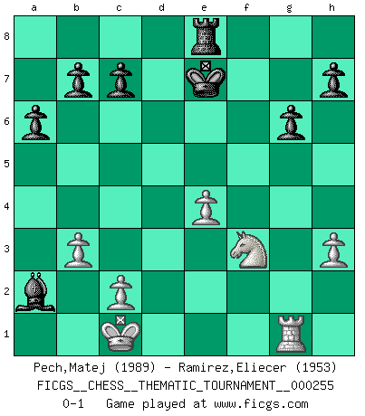 Last move : 0-1 2023 August 11 18:0:20 [Event "FICGS__CHESS__THEMATIC_TOURNAMENT__000255"] [Site "FICGS"] [Date "2023.03.08"] [Round "1"] [White "Pech,Matej"] [Black "Ramirez,Eliecer"] [Result "0-1"] [WhiteElo "1989"] [BlackElo "1953"] 1.d4 f5 2.Qd3 d5 3.g4 fxg4 4.Nc3 Nc6 5.Bg5 Nf6 6.O-O-O Be6 7.h3 Ne4 8.Nxe4 dxe4 9.Qb5 a6 10.Qc5 Bxa2 11.d5 e6 12.Qe3 Ne7 13.dxe6 Nd5 14.e7 Bxe7 15.Qxe4 O-O 16.Bxe7 Qxe7 17.Qxe7 Nxe7 18.b3 g3 19.fxg3 Nf5 20.Nf3 Nxg3 21.Rg1 Nxf1 22.Rd7 Rf7 23.Rxf7 Kxf7 24.Rxf1 Re8 25.e4 Ke7 26.Rg1 g6 0-1 This chess game has been lost on time (started : 2023.03.08 3:1:9) Follow this game move after move (download)I feel as if I were a piece in a game of Chess, when my opponent says of it: That piece cannot be moved. (Soren Kierkegaard) Wer nie einen Fehler gemacht hat, hat nie etwas Neues ausprobiert. (Albert Einstein) Mi estilo es algo parecido entre un poco de Tal y Petrosian. (Reshevsky) À la honte des hommes, on sait que les lois du jeu sont les seules qui soient partout justes, claires, inviolables et exécutées. Pourquoi l'Indien qui a donné les règles du jeu d'échecs est-il obéi de bon gré dans toute la terre, et que les décrétales des papes, par exemple, sont aujourd'hui un objet d'horreur et de mépris ? C'est que l'inventeur des échecs combina tout avec justesse pour la satisfaction des joueurs, et que les papes, dans leurs décrétales, n'eurent en vue que leur seul avantage. L'Indien voulut exercer également l'esprit des hommes et leur donner du plaisir; les papes ont voulu abrutir l'esprit des hommes. Voltaire (Dictionnaire philosophique / Garnier 1967) There are two types of people in this world, good and bad. The good sleep better, but the bad seem to enjoy the waking hours much more. (Woody Allen)