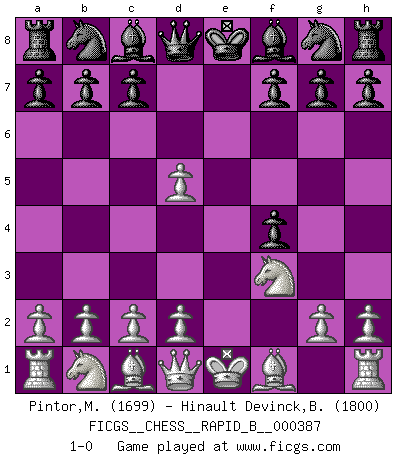 Last move : 1-0 2023 April 12 16:41:5 [Event "FICGS__CHESS__RAPID_B__000387"] [Site "FICGS"] [Date "2023.03.09"] [Round "1"] [White "Pintor,Manuel"] [Black "Hinault Devinck,Bastien"] [Result "1-0"] [WhiteElo "1699"] [BlackElo "1800"] 1.e4 e5 2.f4 d5 3.exd5 exf4 4.Nf3 1-0 This chess game has been lost on time (started : 2023.03.09 14:11:55) Follow this game move after move (download)A passed Pawn increases in strength as the number of pieces on the board diminishes. (Capablanca) Jeder Schachmeister war einmal ein Anfänger. (Irving Chernev) El poder defensivo de una pieza clavada, solamente es imaginario. (Aaron Nimzovich) L'action d'une oeuvre littéraire se déroule sur un champ de bataille. Les masques et les types du drame moderne correspondent aux pièces du jeu d'échecs. L'intrigue correspond aux coups et aux gambits, c'est à dire aux techniques du jeu telles qu'utilisées et interprétées par les joueurs. Les tactiques et les péripéties [mouvements] correspondent aux coups exécutés par l'adversaire. (Viktor Shklovsky) An expert is a man who has made all the mistakes which can be made in a very narrow field. (Niels Bohr)
