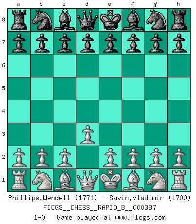Last move : 1-0 2023 April 9 8:14:50 [Event "FICGS__CHESS__RAPID_B__000387"] [Site "FICGS"] [Date "2023.03.09"] [Round "1"] [White "Phillips,Wendell"] [Black "Savin,Vladimir"] [Result "1-0"] [WhiteElo "1771"] [BlackElo "1700"] 1.d3 1-0 This chess game has been lost on time (started : 2023.03.09 14:11:55) Follow this game move after move (download)Chess is played with the mind and not with the hands ! (Renaud and Kahn) Spielt Blackmar-Diemer-Gambit, und das Matt kommt von selbst! (Emil Joseph Diemer) No solamente yo pronostico su triunfo sobre Botvinnik, sino que me adelanto y digo que probablemente Fischer es el jugador de Ajedrez mas grande que haya existido. (John Collins) Demandez au pauvre Cg1 ce qu'il en pense. Eduard Gufeld à propos de la variante Saemisch de l'Est-Indienne. Life is verb, not a noun. (Charlotte Perkins Gilman)