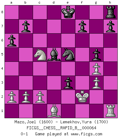 Last move : 0-1 2007 September 12 13:8:51 [Event "FICGS__CHESS__RAPID_B__000064"] [Site "FICGS"] [Date "2007.08.24"] [Round "1"] [White "Mazo,Joel"] [Black "Lemekhov,Yura"] [Result "0-1"] [WhiteElo "1600"] [BlackElo "1700"] 1.e4 c5 2.Nf3 d6 3.d4 cxd4 4.Nxd4 Nf6 5.Nc3 a6 6.Be2 e5 7.Nb3 Be7 8.Be3 Be6 9.f4 exf4 10.Bxf4 Nc6 11.g4 d5 12.e5 Ne4 13.Nxe4 dxe4 14.Qxd8+ Rxd8 15.Rd1 Bh4+ 16.Kf1 Rxd1+ 17.Bxd1 g5 18.Bg3 Bxg3 19.hxg3 Nxe5 20.Nc5 Bd5 21.Kf2 e3+ 0-1 Sicilian : Najdorf, Opovcensky variation Player Black won this chess game. Follow this game move after move (download)A win by an unsound combination, however showy, fills me with artistic horror. (Wilhelm Steinitz) Fischer ist das größte Genie, das je vom Schachhimmel heruntergestiegen ist. (Mikhail Nekhemyevich Tal) Para mi, el Ajedrez es la vida y cada partida es como una nueva vida. Todo jugador de Ajedrez suele vivir muchas vidas durante su vida. (Eduard Gufeld) Je crois qu'il existe des manières très spécifiques de jouer efficacement contre une machine. Evidemment, nous n'avons aucune chance en technique pure, parce que l'ordinateur calcule de manière parfaite. Mais lorsque nous faisons appel à notre cerveau, en utilisant l'intuition et la compréhension, alors nous restons beaucoup plus forts. (Anatoli Karpov) History is the quarrels of popes and kings, with wars or pestilences in every page; the men all so good for nothing, and hardly any women at all. (Jane Austen)