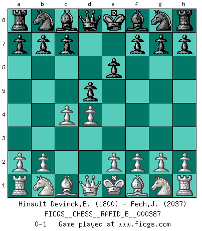 Last move : 0-1 2023 April 16 13:48:20 [Event "FICGS__CHESS__RAPID_B__000387"] [Site "FICGS"] [Date "2023.03.09"] [Round "1"] [White "Hinault Devinck,Bastien"] [Black "Pech,Jaroslav"] [Result "0-1"] [WhiteElo "1800"] [BlackElo "2037"] 1.d4 d5 2.c4 e6 0-1 This chess game has been lost on time (started : 2023.03.09 14:11:55) Follow this game move after move (download)I believe that Chess possesses a magic that is also a help in advanced age. A rheumatic knee is forgotten during a game of Chess and other events can seem quite unimportant in comparison with a catastrophe on the chessboard. (Vlastimil Hort) Sie bekommen vielleicht den Eindruck, dass die Spitzenspieler überhaupt gar nicht so stark sind. Aber das stimmt nicht. Es ist eine Illusion. Mit einem Computer an der Seite ist es sehr leicht, Urteile zu fällen, aber wenn man alleine am Brett sitzt, sieht die Sache ganz anders aus. (Vladimir Kramnik) Después de una mala apertura, hay una esperanza en el juego medio. Pero una vez que estas en finales, el momento de la verdad ha llegado. (Edmar Mednis) 'L'échange des dames est un coup dur pour les deux adversaires...' Un journaliste lors d'une partie du match Spassky-Fischer Empty your mind, be formless, shapeless — like water. (Bruce Lee)