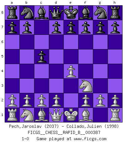 Last move : 1-0 2023 April 17 2:23:30 [Event "FICGS__CHESS__RAPID_B__000387"] [Site "FICGS"] [Date "2023.03.09"] [Round "1"] [White "Pech,Jaroslav"] [Black "Collado,Julien"] [Result "1-0"] [WhiteElo "2037"] [BlackElo "1998"] 1.e4 c5 2.Nf3 1-0 This chess game has been lost on time (started : 2023.03.09 14:11:55) Follow this game move after move (download)Spassky will not be psyched out by Fischer. (Mike Goodall) Wenn ich Weiß habe gewinne ich weil ich Weiß habe, wenn ich Schwarz habe gewinne ich weil ich Bogoljubov bin. (Efim Bogoljubov) Si no le temes a Spassky, entonces elimino el elemento del dinero. (Jim Slater) On entre au jeu d'Echecs comme on entre en Religion. Pour le joueur d'Echecs, la partie d'Echecs c'est l'office, la messe, le défilé du 1er Mai, le dépôt de gerbe au Monument aux Morts. C'est un drame sacré. (Michel Roos) Memory... is the diary that we all carry with us. (Oscar Wilde, The Importance of Being Earnest)