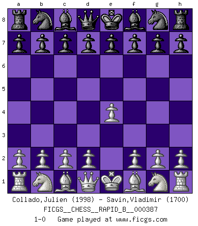 Last move : 1-0 2023 April 8 17:54:20 [Event "FICGS__CHESS__RAPID_B__000387"] [Site "FICGS"] [Date "2023.03.09"] [Round "1"] [White "Collado,Julien"] [Black "Savin,Vladimir"] [Result "1-0"] [WhiteElo "1998"] [BlackElo "1700"] 1.e4 1-0 This chess game has been lost on time (started : 2023.03.09 14:11:55) Follow this game move after move (download)Even the laziest King flees wildly in the face of a double check ! (Aaron Nimzowitsch) Im Hotelzimmer gab es nur zwei Schaben. (Über die Turnierbedingungen) (Peter Swidler) Una de estas pequeñas movidas modestas pudieran ser mas molestas a tu oponente que la amenaza mas grande. (Siegbert Tarrasch) Les Echecs, c'est l'art de la guerre sans les charniers, c'est la résurrection des morts tombés au champ d'honneur, l'espoir perpétuel, la suprématie de l'intelligence sur la force, la culture de l'esprit. (F. Szpiner) Bobby never cared about money, though. His only desire was to prove that his choices were correct: He wanted chess to be important because he was a chess player, and he wanted to be important. Bobby knew money was important, but he didn't have a clue why, outside of clothes and status. The only way he could accomplish what he wanted was to fight for a lot of money. Once he got it, he gave it away. He did not know how to spend it. And once he'd become champion, after, essentially, sacrificing his life for it, he didn't know how to spend his time. (Bob Wade)