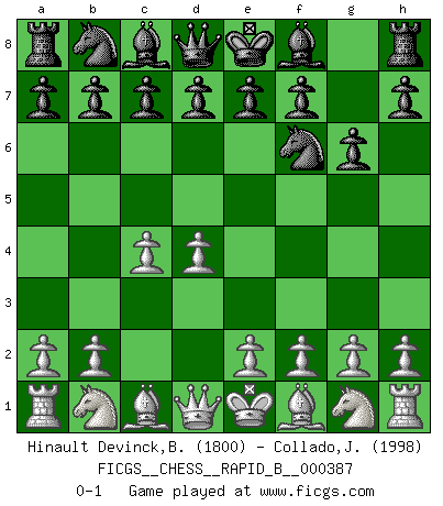 Last move : 0-1 2023 April 26 7:31:49 [Event "FICGS__CHESS__RAPID_B__000387"] [Site "FICGS"] [Date "2023.03.09"] [Round "1"] [White "Hinault Devinck,Bastien"] [Black "Collado,Julien"] [Result "0-1"] [WhiteElo "1800"] [BlackElo "1998"] 1.d4 Nf6 2.c4 g6 0-1 This chess game has been lost on time (started : 2023.03.09 14:11:55) Follow this game move after move (download)No other master has such a terrific will to win. At the board he radiates danger, and even the strongest opponents tend to freeze, like rabbits when they smell a panther. Even his weaknesses are dangerous. As white, his opening game is predictable - you can make plans against it - but so strong that your plans almost never work. In the middle game his precision and invention are fabulous, and in the end game you simply cannot beat him. (Anonymous German Expert) Ein Buch ist ein Spiegel; wenn ein Affe hineinsieht, so kann kein Apostel heraus gucken. (Georg Christoph Lichtenberg) La captura del Rey enemigo es la finalidad pero no el primer objetivo de la partida. (William Steinitz) Le succès, c'est être capable d'aller d'échec en échec sans perdre son enthousiasme. (Winston Churchill) Art is the only way to run away without leaving home. (Twyla Tharp)