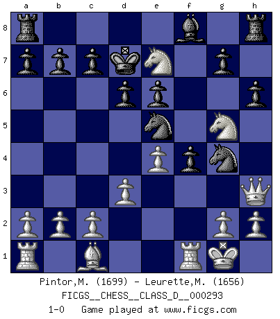 Last move : 1-0 2023 March 19 18:57:47 [Event "FICGS__CHESS__CLASS_D__000293"] [Site "FICGS"] [Date "2023.03.14"] [Round "1"] [White "Pintor,Manuel"] [Black "Leurette,Marc-Antoine"] [Result "1-0"] [WhiteElo "1699"] [BlackElo "1656"] 1.e4 e5 2.f4 d6 3.Nf3 Nc6 4.Bc4 Be6 5.Bxe6 fxe6 6.Ng5 Qe7 7.d3 h6 8.Qh5+ Kd7 9.O-O Nf6 10.Qh3 exf4 11.Nc3 Ne5 12.Nd5 Nfg4 13.Nxe7 1-0 Follow this game move after move (download)Openings teach you openings. Endgames teach you chess ! (Stephan Gerzadowicz) Ein Teil des Fehlers ist immer korrekt. (Savielly Grigorievitsch Tartakower) Yo no creo en la psicología. Yo creo en las buenas movidas. (Bobby Fischer) La victoire dans une partie d'Echecs appartient la plupart du temps à celui qui voit un peu plus loin que l'adversaire. (Lasker) Always two there are. No more no less. A master, and an apprentice. (Master Yoda in Star Wars ep.1)